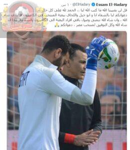 وكتب الحضرى عبر تويتر :”قل لن يصيبنا الله ما كتب الله لنا ،، الحمد لله على كل حال دعواتكم لنا بالشفاء انا و ابو جبل واللحاق ببعثة المنتخب في الكاميرون قريبا ان شاء الله ، وان شاء الله نتمنى وصول باقي افراد البعثة الى الكاميرون بالسلامة غدا ان شاء الله وكل التوفيق لمنتخب مصر ، دعواتكم”.