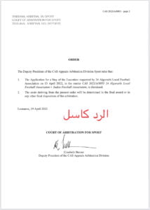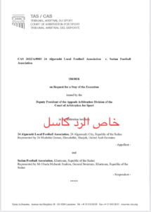 رفضت محكمة التحكيم الرياضي بلوزان “كاس” الطلب الذي تقدم به ابا ذر الصديق رئيس الإتحاد المحلي لكرة القدم 24 القرشي بواسطة محاميه “مدثر عثمان عثمان خيري” والذي طالب فيه بوقف تنفيذ قرار لجنة الإستئنافات المنتخبة بالإتحاد السوداني لكرة القدم لحين الفصل في القضية.