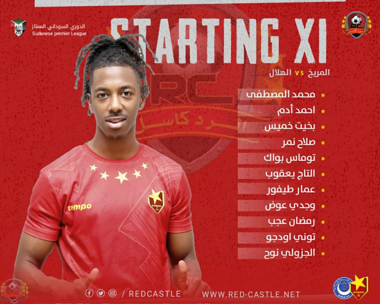 تحصلت الرد كاسل على تشكيلة المريخ التي سيواجه بها فريق الهلال بعد قليل بقلعة شيكان حيث ضمت توليفة ابراهومة كل من محمد المصطفي في حراسة المرمى وأمامه كل من توماس بواك وصلاح نمر وبخيت خميس واحمد ادم بيبو وفي وسط الملعب الثلاثي عمار طيفور وجدي عوض والتاح يعقوب وفي المقدمة الهجومية يلعب الثلاثي توني ايدجو ماري والجزولي نوح ورمضان عجب ويحاول ابراهومة الاستفادة من اللاعبين الاكثر جاهزية  في ظل الاصابات المتلاحقة التي ابعدت عدد كبير من اللاعبين الأساسيين.