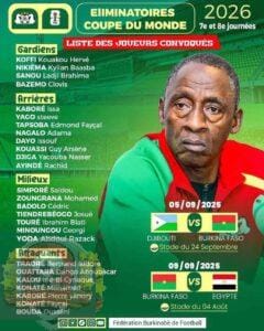 أعلن المدير الفني لمنتخب بوركينا فاسو، عن قائمة المنتخب، لمباراتي جيبوتي ومصر، في الجولتين السابعة والثامنة من تصفيات كأس العالم، يومي الخامس والتاسع من سبتمبر المقبل.