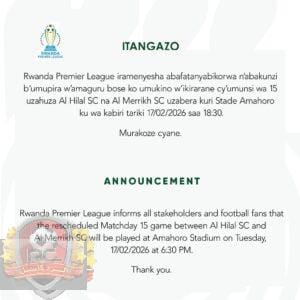 أعلن الإتحاد الرواندي لكرة القدم، عن نقل مباراة القمة بين المريخ والهلال، المؤجلة من الجولة 15 من الدوري الرواندي، المقررة يوم غد الثلاثاء، من ملعب كيجالي بيليه، إلى ملعب اماهورو، على أن تقام في الساعة السادسة والنصف مساء.