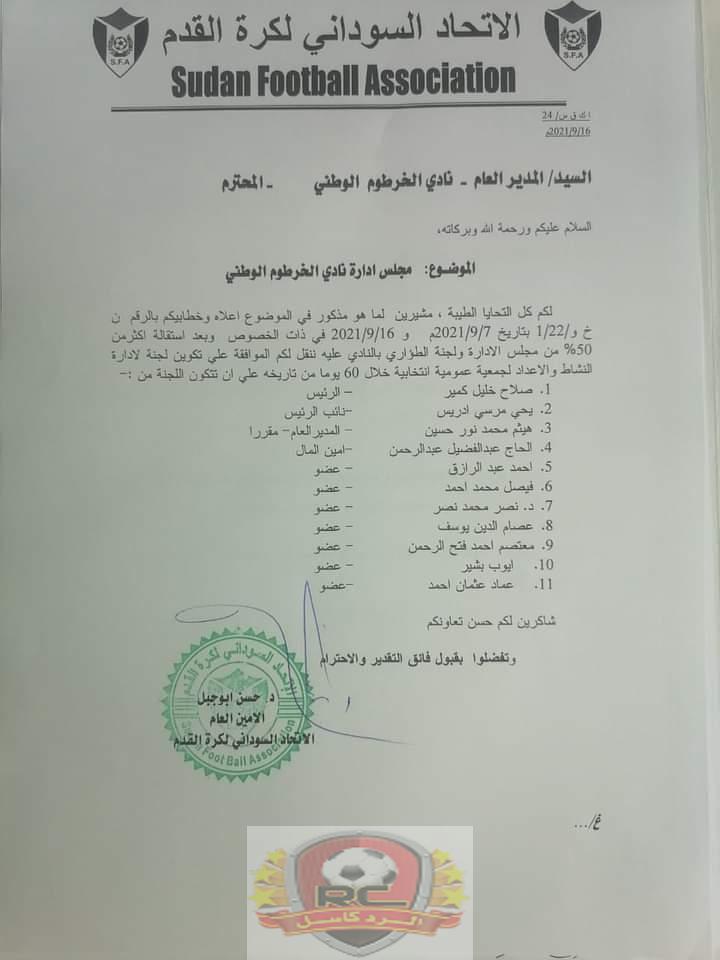 بناء علي خطابات المدير العام لنادي الخرطوم الوطني بتأريخ 7 و 16 سبتمبر الجاري و التي تحوي افادات باستقالة اكثر من 50٪ من اعضاء مجلس الادارة و اعضاء لجنة الطوارئ فقد قرر الاتحاد السوداني لكرة القدم تكوين لجنة تطبيع تقود النادي لمدة شهرين تحضيرا لجمعية انتخابية لتكوين مجلس انتخابي.
