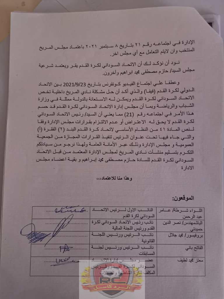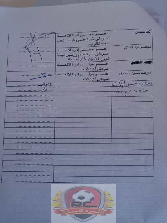 ووقع على المذكرة نواب رئيس اتحاد كرة القدم الأربعة اللواء الدكتور عامر عبد الرحمن ونصر الدين حميدتي والبروفسير محمد جلال والفاتح باني وعدد من اعضاء مجلس إدارة اتحاد الكرة بينهم محمد حلفا ومعتز الشاعر ومعتصم عبد السلام وميرفت حسين والدخيري ومامون بشارة.