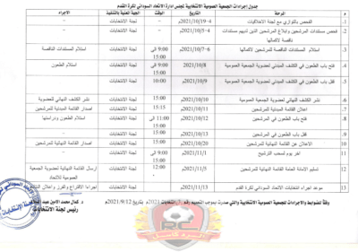 اعلنت لجنة الانتخابات الخاصة بالجمعية العمومية لانتخاب مجلس إدارة جديد للاتحاد العام لكرة القدم والمنتظر قيامها في نوفمبر المقبل الجدول الرسمي للانتخابات حيث تقرر أن يبدأ الفحص بالتوازي مع لجنة الأخلاقيات من يوم الرابع من أكتوبر وحتى التاسع عشر من نفس الشهر فيما يكون فحص مستندات المرشحين َوابلاغ من لهم نواقص في الفترة من الرابع من أكتوبر وحتى الخامس منه