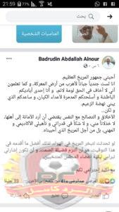 نشر نائب رئيس مجلس إدارة نادي المريخ للشؤون القانونية المستقيل بدر الدين النور تدوينة مثيرة أشعلت مواقع التواصل الاجتماعي عبر صفحته بالفيسبوك حيث كشف عبرها إنه ليس جبانا الا انه فضل الصمت حفاظا على وحدة المريخ وجاء في التدوينة :أحبتي جمهور المريخ العظيم.