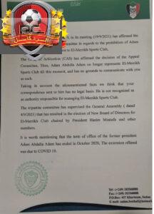 تحصلت الرد كاسل على تفاصيل مهمة بخصوص الخطاب الذي أرسله الاتحاد العام لكرة القدم لمحكمة التحكيم الرياضية كأس حيث اخطرها الاتحاد عن طريق نائب الرئيس للشؤون القانونية الاستاذ معتز الشاعر مفيدا بأن كمال شداد رئيس الاتحاد السابق قام باخفاء كل الخطابات التي وصلت من كاس وذلك بمساعدة الأمين العام السابق للاتحاد الدكتور حسن أبوجبل موكدين في الخطاب ان كمال شداد كان يدعم آدم سوداكال وذلك لاغراض انتخابية مشيرا في الخطاب الي أن مجلس إدارة الاتحاد لم يحل المجلس السابق ولم يعين اي لجنة تطبيع كما تم الادعاء .