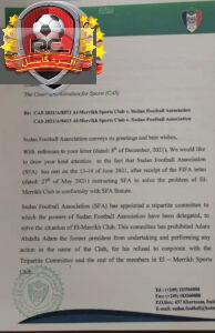 كما اخطر الاتحاد العام محكمة كأس بأن الاتحاد العام لكرة القدم هو من فوض اللجنة الثلاثية بحل مشكلة المريخ وتم منحها صلاحيات كاملة من مجلس أداة الاتحاد كما تم من خلال الخطاب إبلاغ كاس بان سوداكال رفض الانضمام إلى إجتماعات اللجنة الثلاثية وأشار الاتحاد العام أيضا لمحكمة كاس في خطابه ان لجنة الاستئنافات اوقفت سوداكال ولم تعد له اي صفة يخاطب بها أي جهة وأوضح خطاب الاتحاد ان اللجنة الثلاثية والتي باركها الفيفا هي من أشرفت على انتخابات المريخ وعلى أعمال الجمعية العمومية التي انتخبت السيد حازم مصطفى رئيسا مشيرا الي أن التمديد السابق لسوداكال كان بسبب ظروف الكورونا ومن خلال الخطاب فإن الاتحاد العام طلب من كاس تحديد جلسة سماع وذلك من أجل إتاحة الفرصة للاتحاد العام حتى يوضح الحقائق الكاملة والصحيحة بعيدا عن التضليل.