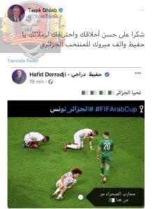 وكتب طارق دياب في تغريدة على حسابه بموقع تويتر: “شكراً على حسن أخلاقك و احترامك لزملائك يا حفيظ و ألف مبروك للمنتخب الجزائري”، مُرفقاً تغريدته بالصورة التي حذفها حفيظ دراجي.